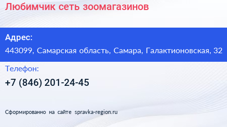 Любимчик, сеть зоомагазинов по адресу 443099, Самарская область, Самара, Галактионовская, 32 в дальнейшем Организация, размещена в следующих категориях: