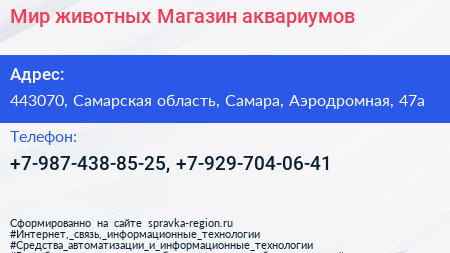 Мир животных, Магазин аквариумов по адресу 443070, Самарская область, Самара, Аэродромная, 47а в дальнейшем Организация, размещена в следующих категориях: