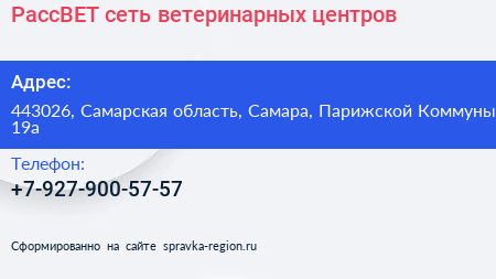 РассВЕТ, сеть ветеринарных центров по адресу 443026, Самарская область, Самара, Парижской Коммуны, 19а в дальнейшем Организация, размещена в следующих категориях:
