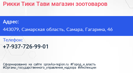 Рикки-Тики-Тави, магазин зоотоваров по адресу 443079, Самарская область, Самара, Гагарина, 46 в дальнейшем Организация, размещена в следующих категориях: