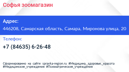 Софья, зоомагазин по адресу 446208, Самарская область, Самара, Миронова улица, 20 в дальнейшем Организация, размещена в следующих категориях: