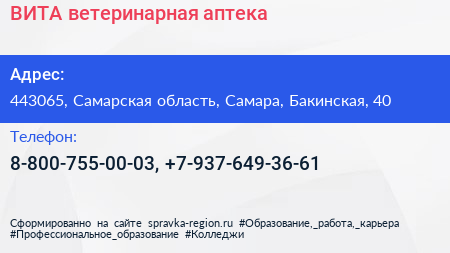 ВИТА, ветеринарная аптека по адресу 443065, Самарская область, Самара, Бакинская, 40 в дальнейшем Организация, размещена в следующих категориях: