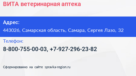 ВИТА, ветеринарная аптека по адресу 443026, Самарская область, Самара, Сергея Лазо, 32 в дальнейшем Организация, размещена в следующих категориях: