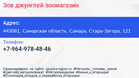Зов джунглей, зоомагазин по адресу 443081, Самарская область, Самара, Стара-Загора, 121 в дальнейшем Организация, размещена в следующих категориях: