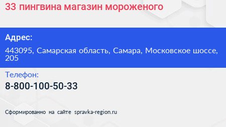 33 пингвина, магазин мороженого по адресу 443095, Самарская область, Самара, Московское шоссе, 205 в дальнейшем Организация, размещена в следующих категориях: