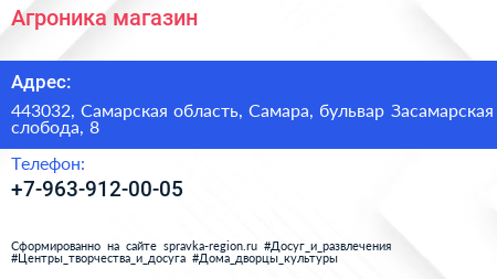 Агроника, магазин по адресу 443032, Самарская область, Самара, бульвар Засамарская слобода, 8 в дальнейшем Организация, размещена в следующих категориях: