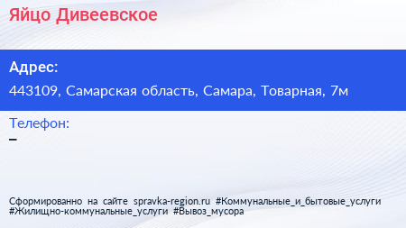 Яйцо Дивеевское по адресу 443109, Самарская область, Самара, Товарная, 7м в дальнейшем Организация, размещена в следующих категориях: