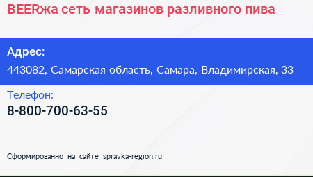 BEERжа, сеть магазинов разливного пива по адресу 443082, Самарская область, Самара, Владимирская, 33 в дальнейшем Организация, размещена в следующих категориях: