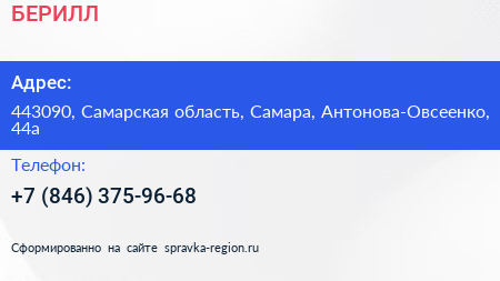 БЕРИЛЛ по адресу 443090, Самарская область, Самара, Антонова-Овсеенко, 44а в дальнейшем Организация, размещена в следующих категориях: