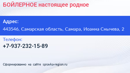 БОЙЛЕРНОЕ настоящее & родное по адресу 443546, Самарская область, Самара, Иоанна Снычева, 2 в дальнейшем Организация, размещена в следующих категориях: