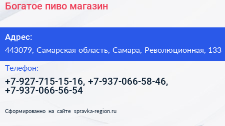 Богатое пиво, магазин по адресу 443079, Самарская область, Самара, Революционная, 133 в дальнейшем Организация, размещена в следующих категориях: