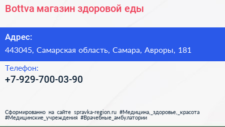 Bottva, магазин здоровой еды по адресу 443045, Самарская область, Самара, Авроры, 181 в дальнейшем Организация, размещена в следующих категориях: