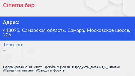 Cinema, бар по адресу 443095, Самарская область, Самара, Московское шоссе, 205 в дальнейшем Организация, размещена в следующих категориях: