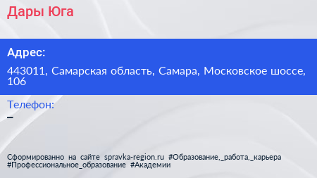 Дары Юга по адресу 443011, Самарская область, Самара, Московское шоссе, 106 в дальнейшем Организация, размещена в следующих категориях: