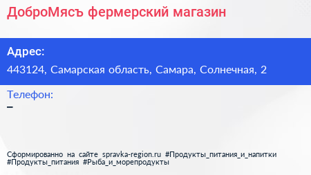 ДоброМясъ, фермерский магазин по адресу 443124, Самарская область, Самара, Солнечная, 2 в дальнейшем Организация, размещена в следующих категориях: