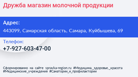 Дружба, магазин молочной продукции по адресу 443099, Самарская область, Самара, Куйбышева, 69 в дальнейшем Организация, размещена в следующих категориях: