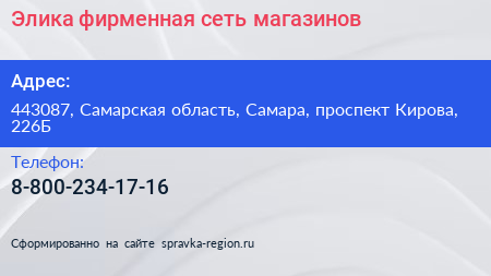 Элика, фирменная сеть магазинов по адресу 443087, Самарская область, Самара, проспект Кирова, 226Б в дальнейшем Организация, размещена в следующих категориях:
