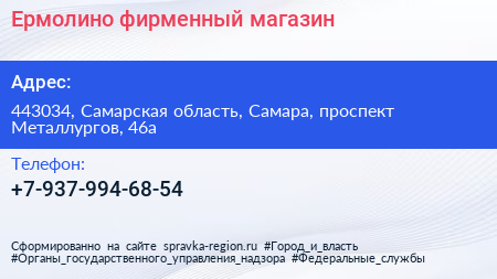 Ермолино, фирменный магазин по адресу 443034, Самарская область, Самара, проспект Металлургов, 46а в дальнейшем Организация, размещена в следующих категориях: