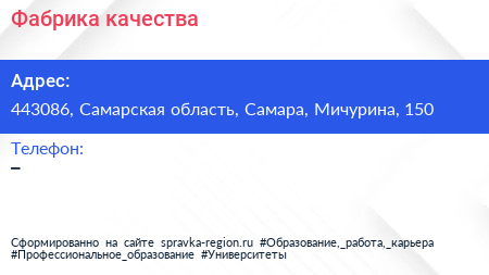 Фабрика качества по адресу 443086, Самарская область, Самара, Мичурина, 150 в дальнейшем Организация, размещена в следующих категориях: