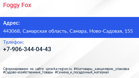Foggy Fox по адресу 443068, Самарская область, Самара, Ново-Садовая, 155 в дальнейшем Организация, размещена в следующих категориях: