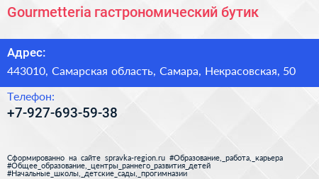 Gourmetteria, гастрономический бутик по адресу 443010, Самарская область, Самара, Некрасовская, 50 в дальнейшем Организация, размещена в следующих категориях: