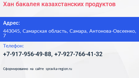 Хан, бакалея казахстанских продуктов по адресу 443045, Самарская область, Самара, Антонова-Овсеенко, 7 в дальнейшем Организация, размещена в следующих категориях: