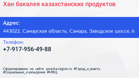 Хан, бакалея казахстанских продуктов по адресу 443022, Самарская область, Самара, Заводское шоссе, 6 в дальнейшем Организация, размещена в следующих категориях: