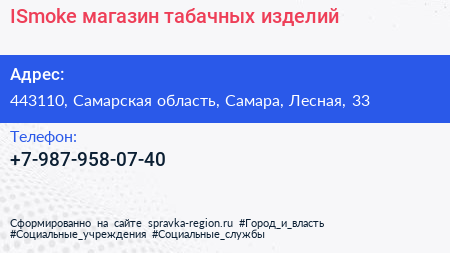ISmoke, магазин табачных изделий по адресу 443110, Самарская область, Самара, Лесная, 33 в дальнейшем Организация, размещена в следующих категориях: