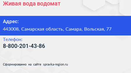 Живая вода, водомат по адресу 443008, Самарская область, Самара, Вольская, 77 в дальнейшем Организация, размещена в следующих категориях: