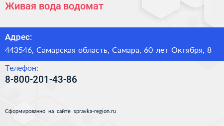 Живая вода, водомат по адресу 443546, Самарская область, Самара, 60 лет Октября, 8 в дальнейшем Организация, размещена в следующих категориях: