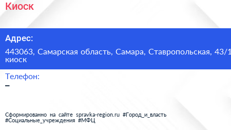 Киоск по адресу 443063, Самарская область, Самара, Ставропольская, 43/1 киоск в дальнейшем Организация, размещена в следующих категориях: