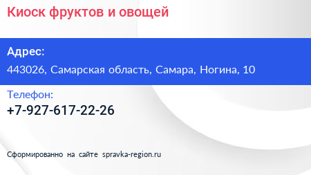 Киоск фруктов и овощей по адресу 443026, Самарская область, Самара, Ногина, 10 в дальнейшем Организация, размещена в следующих категориях: