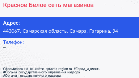 Красное & Белое, сеть магазинов по адресу 443067, Самарская область, Самара, Гагарина, 94 в дальнейшем Организация, размещена в следующих категориях: