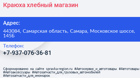 Краюха, хлебный магазин по адресу 443084, Самарская область, Самара, Московское шоссе, 145Б в дальнейшем Организация, размещена в следующих категориях: