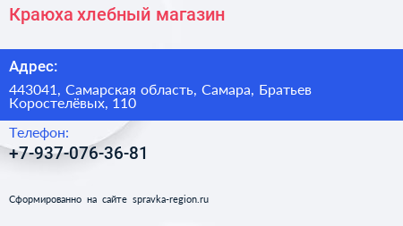 Краюха, хлебный магазин по адресу 443041, Самарская область, Самара, Братьев Коростелёвых, 110 в дальнейшем Организация, размещена в следующих категориях: