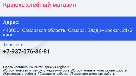 Краюха, хлебный магазин по адресу 443030, Самарская область, Самара, Владимирская, 21/2 киоск в дальнейшем Организация, размещена в следующих категориях: