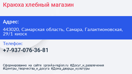 Краюха, хлебный магазин по адресу 443020, Самарская область, Самара, Галактионовская, 29/1 киоск в дальнейшем Организация, размещена в следующих категориях: