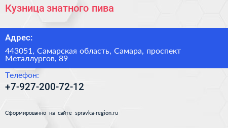 Кузница знатного пива по адресу 443051, Самарская область, Самара, проспект Металлургов, 89 в дальнейшем Организация, размещена в следующих категориях: