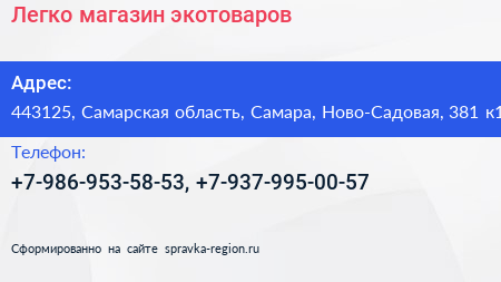 Легко, магазин экотоваров по адресу 443125, Самарская область, Самара, Ново-Садовая, 381 к1 в дальнейшем Организация, размещена в следующих категориях: