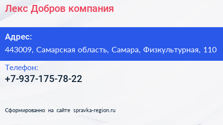 Лекс Добров, компания по адресу 443009, Самарская область, Самара, Физкультурная, 110 в дальнейшем Организация, размещена в следующих категориях: