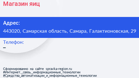 Магазин яиц по адресу 443020, Самарская область, Самара, Галактионовская, 29 в дальнейшем Организация, размещена в следующих категориях: