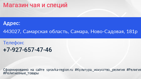 Магазин чая и специй по адресу 443027, Самарская область, Самара, Ново-Садовая, 181р в дальнейшем Организация, размещена в следующих категориях: