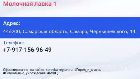 Молочная лавка №1 по адресу 446200, Самарская область, Самара, Чернышевского, 14 в дальнейшем Организация, размещена в следующих категориях: