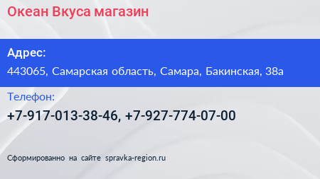 Океан Вкуса, магазин по адресу 443065, Самарская область, Самара, Бакинская, 38а в дальнейшем Организация, размещена в следующих категориях: