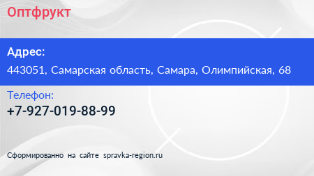 Оптфрукт по адресу 443051, Самарская область, Самара, Олимпийская, 68 в дальнейшем Организация, размещена в следующих категориях: