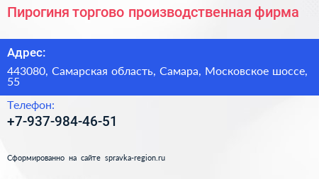 Пирогиня, торгово-производственная фирма по адресу 443080, Самарская область, Самара, Московское шоссе, 55 в дальнейшем Организация, размещена в следующих категориях: