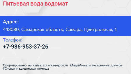 Питьевая вода, водомат по адресу 443080, Самарская область, Самара, Центральная, 1 в дальнейшем Организация, размещена в следующих категориях: