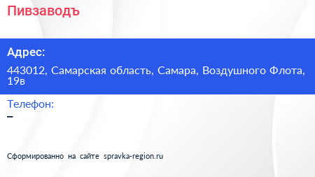 Пивзаводъ по адресу 443012, Самарская область, Самара, Воздушного Флота, 19в в дальнейшем Организация, размещена в следующих категориях:
