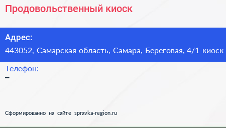 Продовольственный киоск по адресу 443052, Самарская область, Самара, Береговая, 4/1 киоск в дальнейшем Организация, размещена в следующих категориях: