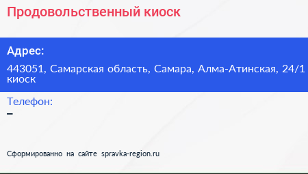 Продовольственный киоск по адресу 443051, Самарская область, Самара, Алма-Атинская, 24/1 киоск в дальнейшем Организация, размещена в следующих категориях: